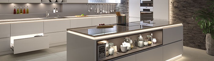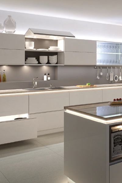 See lighting inside drawers and cupboards, washing feature walls, under wall cabinet working lights, mood lighting under islands and some example contemporary pendant ceiling lights.
